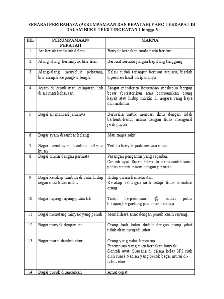 Perumpamaan Bahasa Melayu from image.slidesharecdn.com Bagai air dengan minyak dua hal yang tidak bisa dipersatukan. Nasihat yang baik sukar masuk kepada orang yang bodoh. (tidak ada gunanya berbuat baik kepada orang jahat). Lemah dan lesu tanpa penyakit. Artinya mencari kaumnya atau bangsanya sendiri. Air pun ada pasang surutnya=senang dan susah selalu silih berganti. Artinya memberi nasihat baik kepada orang yang jahat terlalu susah masuknya. Bagai alah main, menang sorak.